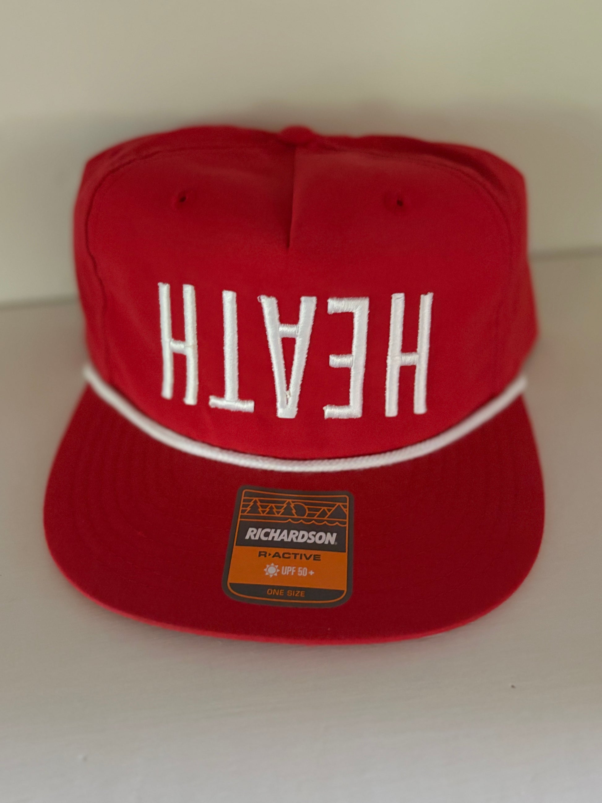 Richardson 256 - Red flatbill snap back white rope and upside down "HEATH".