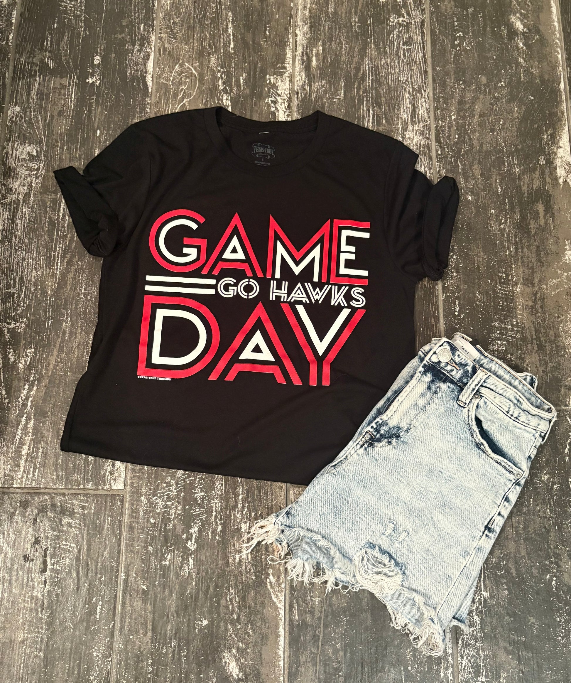 Striped Game Day on Black Bella Canvas Tee. This Tee is a unisex fit, true to size, and ready for any sporting event!